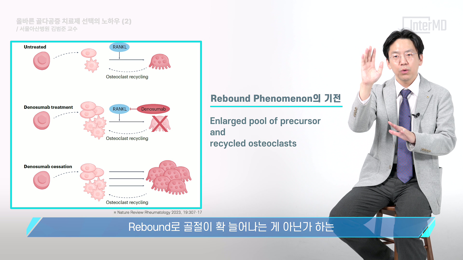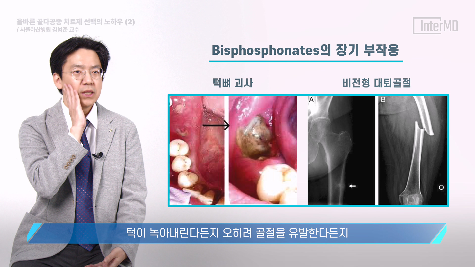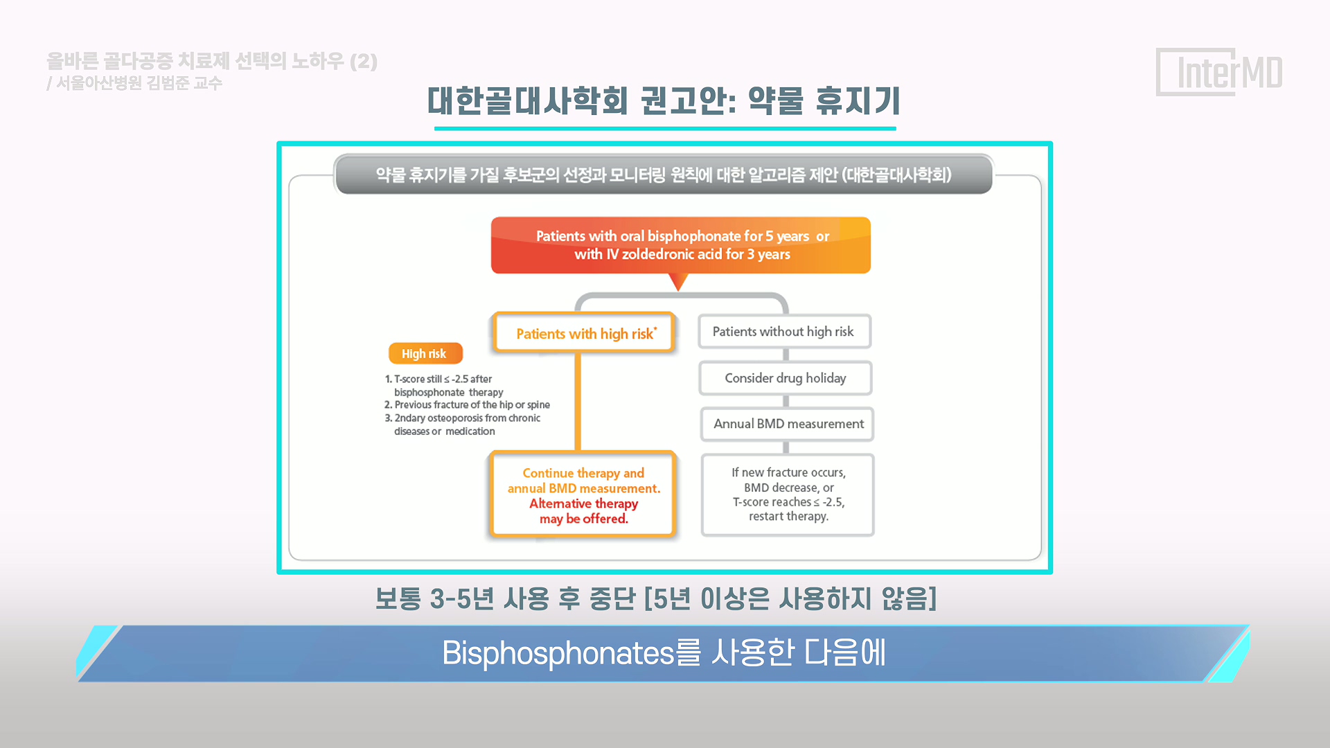 골다공증 치료제의 분류 기준과 골절 위험도에 따른 초기 치료 방법을 다루었던 지난 v-Pick에 이어 이번에는 대한골대사학회 권고안과 Denosumab → Bisphosphonates 교차 투여 등 '올바른 골다공증 치료제 선택'에 대해 서울아산병원 내분비내과 김범준 교수님께서 강의해 주셨습니다.